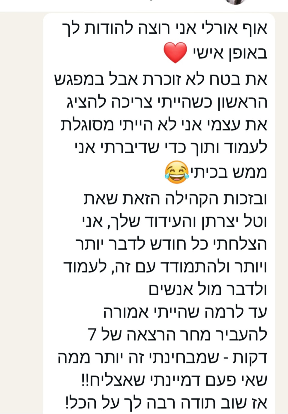 מילות תודה ממשתתפת מקהילת צעירים בעלי עסקים בהנחייתי